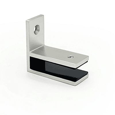Attache murale en acier inoxydable permettant la fixation directe d’un panneau de verre à un mur. Solution propre et élégante pour une installation stable et discrète.